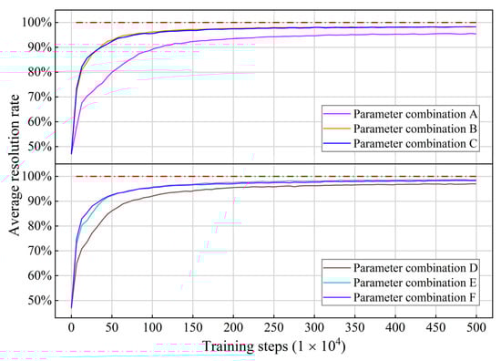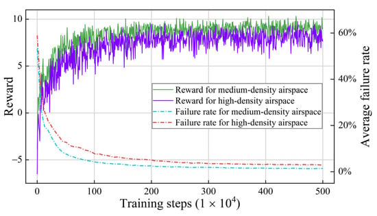 The situation in which 20–30 aircraft arrive at airspace A within 10 min is defined as medium-density airspace, and the situation in which 30–40 aircraft are loaded is defined as high-density airspace. The airspace density of the high-density airspace is 1.4 times that of the medium-density airspace. The training and testing process uses ACKTR. The training process is shown in Figure 14, where . The increase in airspace density leads to a slight decline in the training effect but does not lead to the collapse or divergence of the model, indicating that the model maintains good stability and convergence under the stress test.
