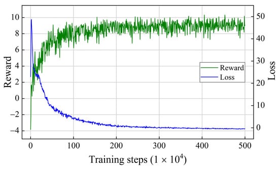 The proposed neural network architecture can be regarded as a global neural network. Therefore, we can update the global network with only one loss function, that is, we can update the parameters of the critic and the actor simultaneously. Suppose that there are threads and that the agent in each thread interacts in steps with its environment in one multithreaded interaction; then, it collects the experience dataset (). Then, we have . The loss function is defined as Equation (13). Let and be the constant coefficients and be the action space.