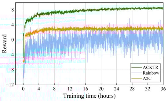 ACKTR, Rainbow, and A2C used the same reward function and dataset with the learning curves, as shown in Figure 12. We averaged the rewards for every 60 s of training. Table 6 presents the training data after 30 h of training time to observe the model performance after convergence. It can be seen that ACKTR outperformed the other two algorithms in terms of computational efficiency and post-convergence performance. Furthermore, as algorithms for training policy networks, ACKTR and A2C presented more minor training variances than those presented by Rainbow. The model performance of ACKTR continued to improve when A2C converged at approximately 4 h, demonstrating that the natural gradient method can make the model exceed the local optimum solution.
