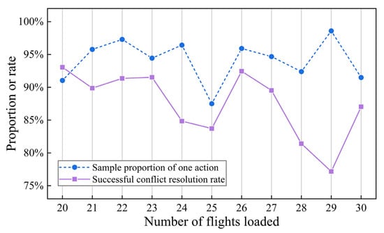The TCS agent’s solution which uses one action to resolve the conflict pair is better than the solution which uses two actions. Among the 871 test samples that were successfully resolved using ACKTR, approximately 94.14% were resolved by a single action. Considering the samples resolved in the testing set, the relationship between the proportion of samples in which the agent performed one action and the number of flights loaded in the sample is shown in Figure 13. The figure also shows the relationship between the conflict resolution rate and the number of flights loaded in the sample. The number of flights loaded reflects the airspace density.