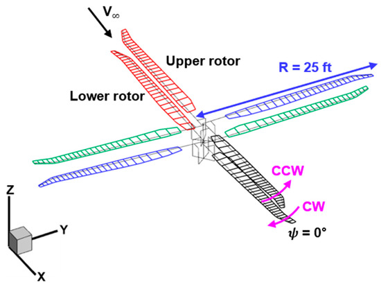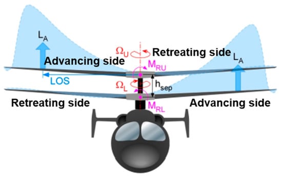 The compound helicopters using a lift-offset coaxial rotor (or rigid coaxial rotor, Figure 1) and auxiliary propulsion, among the various concepts of compound helicopters, are capable of high-speed flight over 200 knots and long-range flights as compared with conventional helicopters [3]. The lift-offset coaxial rotor with the Advancing Blade Concept (ABC) generates lift forces only on the advancing sides of the upper and lower rotors, unlike the single rotor, which generates lifts on both the advancing and retreating sides of the rotor, thus, the dynamic stall of the retreating side can be avoided at the lift-offset coaxial rotor. Furthermore, the lift-offset coaxial rotor does not need to trim the rotor hub roll moment because the hub roll moments of the upper and lower rotors are the same magnitude and in opposite directions. Thereby, the aerodynamic performance of the lift-offset coaxial rotor may be improved compared with the single rotor since more lift forces are generated on the advancing side of the lift-offset coaxial rotor. Lift-offset compound helicopters (Figure 2) appropriately reduce the rotor rotational speed and use the auxiliary propulsion system to achieve high-speed flights; however, they use blades with extremely high stiffness to maintain the spacing between the upper and lower rotor blades. Therefore, significant vibrations are generated in high-speed flights.