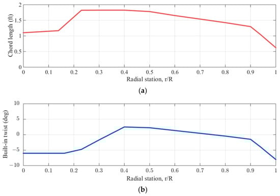 Table 1 describes the general properties of the lift-offset coaxial rotor for the 30,000-pound-class high-speed long-range utility helicopter. This hypothetical helicopter is similar to the SB > 1 Defiant helicopter with a gross weight (GW) of 30,000 lb; however, it is not designed and developed at this time. Therefore, the rotor radius is obtained from SB > 1 Defiant [20]. The blade section properties are derived and modified from those of the X2TD rotor [7] along with the application of the Mach-scaling law. In addition, the unique chord length and built-in twist distributions (Figure 4) in the radial direction are obtained from those for the lift-offset coaxial rotor model of the S-97 Raider [10]. The rotor blade has seven nonlinear finite beam elements for the blade structural dynamics modeling. The rotor control system including the swashplate, pitch link, and pitch horn is also modeled.