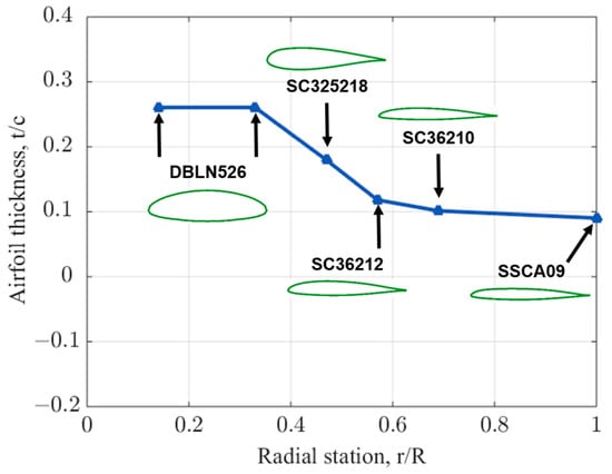 The different airfoils in the radial direction (Figure 5) for the aerodynamics modeling of the lift-offset coaxial rotor are used. These airfoils are assumed identical to those of the X2TD rotor [7]. The airfoil tables including aerodynamic coefficients were generated by MSES+ [21] in the authors’ previous work [7]. In addition, the Reynolds number correction method [22] is applied to the present modeling. The rotor blade consists of 25 aerodynamic panels and the width of the panels at the blade root and tip are 6.30%R and 2.60%R, respectively. Figure 6 shows the CAMRAD II model of the lift-offset coaxial rotor for the 30,000-pound-class high-speed long-range utility helicopter, particularly the rotor with only the sweepback angle.