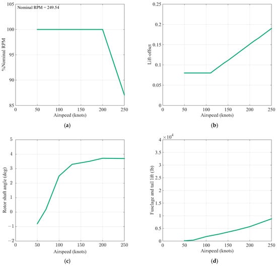 Operational conditions for 30,000-pound-class high-speed long-range utility helicopter: (a) rotor rotational speed; (b) lift-offset; (c) rotor shaft tilt angle; (d) fuselage and tail lifts.