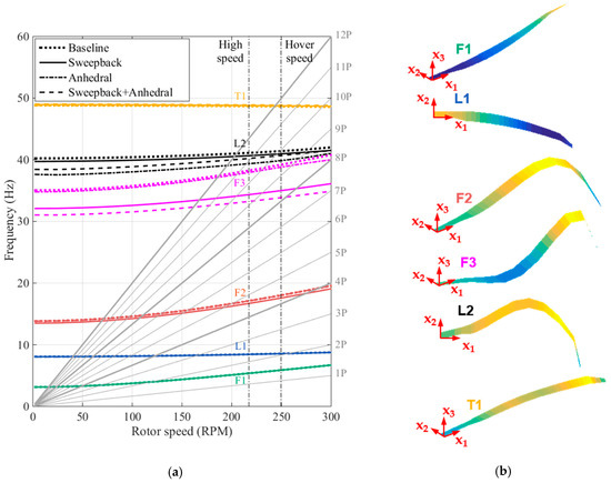 Natural frequencies of rotating blade for the lift-offset coaxial rotor: (a) rotating blade natural frequency; (b) mode shapes with sweepback angle at non-rotating condition.