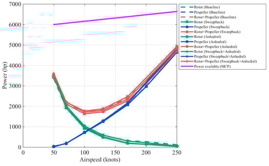 Figure 12 indicates the lift and drag forces for the present lift-offset coaxial rotor with both sweepback and anhedral angles, one of the various blade tip configurations. Since the variations in the lift and drag forces in terms of the airspeeds are similar for the rotors using various blade tip configurations, the results for the rotor with both sweepback and anhedral angles are described in this section. As shown in the figure, the lift forces of the upper and lower rotors are almost equal, and the lift forces for the upper and lower rotors decrease as the flight speed increases. However, the fuselage and tail lift forces increase when the flight speed increases. In addition, the drag forces for the upper and lower rotors are also similar to each other and increase with the increase in airspeed. Furthermore, the airframe drag force calculated by Equation (4) also increases as the flight speed increases.