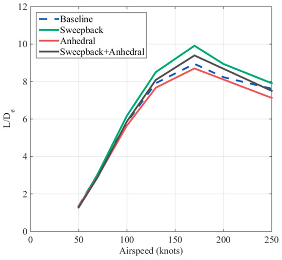 Figure 11 illustrates the variations in the rotor effective lift-to-drag ratio (L/De). The trends of L/De are similar for the different blade tip configurations and the L/De decreases with an increase in flight speed after the maximum value at 170 knots. Compared with the baseline rotor model using neither the sweepback angle nor anhedral angle, the maximum L/De increases by 10.82% when the rotor blade tip has a sweepback angle of 20°. The maximum L/De for the rotor blade with only an anhedral angle of 10° decreases by 2.75% and 12.25% at 170 knots compared with the baseline rotor model and the rotor with only a sweepback angle, respectively. In addition, when the rotor blade tip uses both sweepback and anhedral angles, the maximum L/De increases by 5.02% and 7.99% compared with the results for the baseline rotor model and rotor blade with only anhedral angle, respectively. Furthermore, the maximum L/De for the rotor blade with both sweepback and anhedral angles decreases by 5.24% as compared with that for the rotor with the sweepback angle. Thus, it is investigated that the performance of the lift-offset coaxial rotor can be improved when the rotor blade tip has a sweepback angle.
