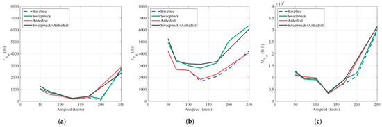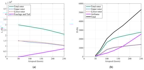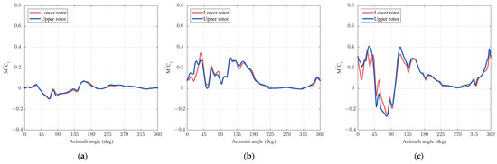 The total rotor thrust, torque, and individual rotor’s hub pitch moment and hub roll moment are considered as the trim targets for the present rotor. The hub roll moments (MX) for the upper and lower rotors are calculated using the assumed lift-offset values at the given flight speeds (Figure 7b) and individual rotor’s thrust (T) and rotor radius (R) using Equation (1).