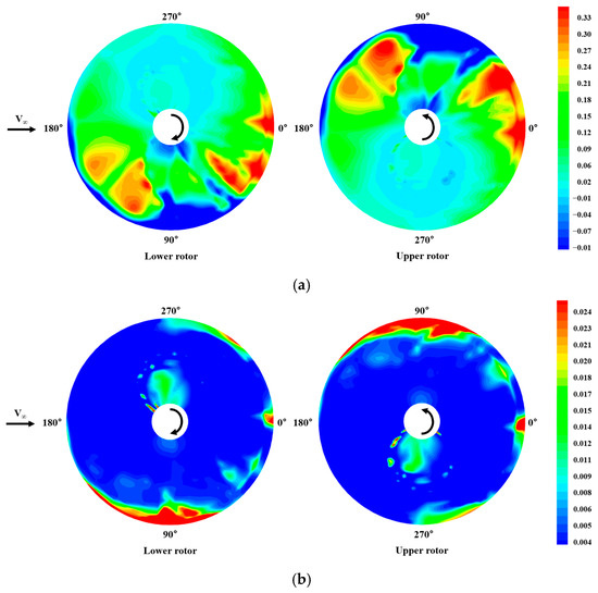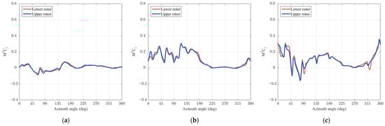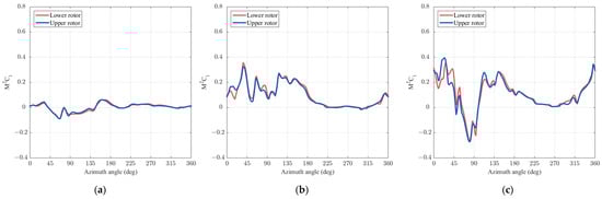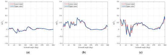 In the present analyses, the rotor performance and hub vibration are calculated using an azimuthal step of 15°; however, the blade airloads are predicted with the refined azimuthal increment of 3.6° to represent elaborately the aerodynamic interference effect between the upper and lower rotors, which will be discussed in Section 3.3.