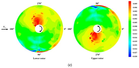 The anhedral angle at the blade tip may reduce the BVI noise [18] as described previously; therefore, the section lift gradients (d(M2Cl)/dΨ) that are closely related to the rotor BVI [25,26] are investigated instead of the rotor aeroacoustics analyses in this study. In this section, Figure 18 shows the gradient of the rotor blade section lifts for the rotors using different rotor blade tip configurations. The M2Cl gradients at 0° ≤ Ψ ≤ 45° in the blade outboard region where BVI is observed clearly are especially compared to investigate the effect of the anhedral angle at the rotor blade tip on the rotor BVI. The amplitudes of the rotor blade section lift gradient at 0° ≤ Ψ ≤ 45° with only anhedral (Figure 18b) or with both sweepback and anhedral angles (Figure 18c) decrease compared with the baseline rotor model without both sweepback and anhedral angles (Figure 18a). Therefore, it is expected that the BVI noise may be reduced when the anhedral applies at the blade tip of the lift-offset coaxial rotor.