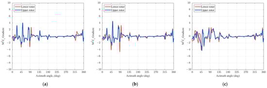 Rotor blade section lift force (M2Cl) gradients in the blade outboard region (86%R) at 250 knots: (a) without sweepback and anhedral angles (baseline rotor model); (b) without sweepback and with anhedral angle; (c) with sweepback and anhedral angles.