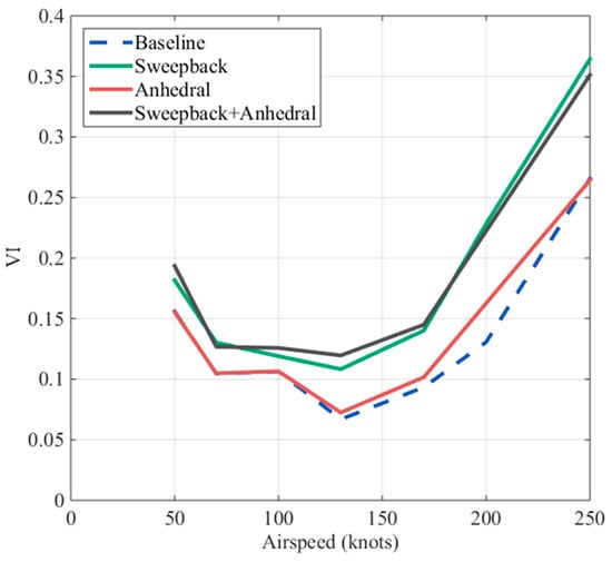 Figure 20 indicates the rotor vibration index (VI) in terms of flight speed. The VI is calculated using Equation (5). As observed in the figure, the shapes of the VI curves for the rotors with various blade tip configurations are similar to each other. The maximum VI for the rotor with only a sweepback angle at 250 knots is higher by 37.14% than the results for the baseline rotor without sweepback and anhedral angles. It is found that the VI for the rotor with only a sweepback angle increases compared with the baseline rotor model. This is because the magnitude of the negative tip loading with the sweepback angle increases (Figure 15 and Figure 17). The maximum values of the VI for the rotor with only an anhedral angle at 250 knots are lower by 0.47% and 27.42% than those of the baseline rotor model and the rotor with only a sweepback angle, respectively. For the rotor with both sweepback and anhedral angles, the maximum values of VI are higher by 32.20% and 32.82% than those of the baseline rotor and the rotor with only an anhedral angle, respectively. Furthermore, the maximum VI for the rotor with both sweepback and anhedral angles is lower than that for the rotor using only a sweepback angle by 3.60%. It is investigated that the sweepback angle at the rotor blade tip improves the rotor aerodynamic performance (Figure 11) but also increases the rotor hub vibration.