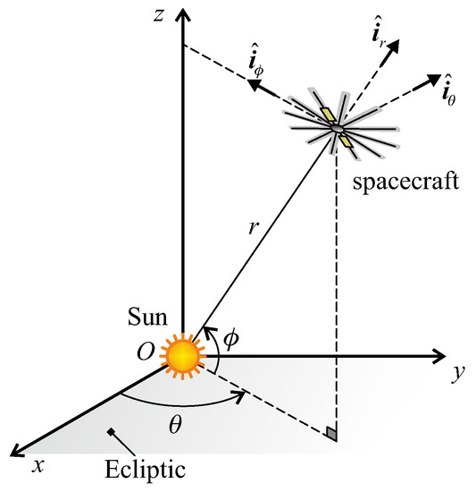 Consider a spacecraft that initially (time ) traces a heliocentric circular orbit in the ecliptic plane. Let be the orbital radius and introduce a spherical reference frame with its origin O coinciding with the Sun’s center-of-mass, where r is the Sun–spacecraft distance, is the ecliptic longitude, and is the ecliptic latitude; see Figure 1. In the same figure, is the radial unit vector, is the trasverse unit vector, and is the azimuthal unit vector.