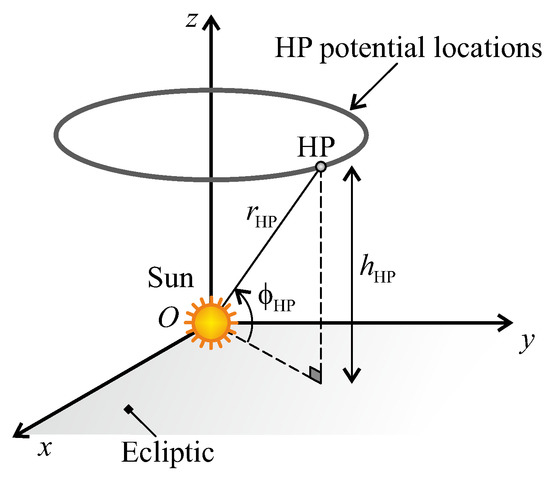The HP to be reached and maintained by the spacecraft is characterized by a given distance from the Sun and a prescribed ecliptic latitude . The ecliptic longitude, instead, is left free, so that the pair locates a sort of “ring” of possible static equilibrium points placed at a distance from the ecliptic, as sketched in Figure 2. The special case when coincides with an HP that lies on the ecliptic at a distance from the star.