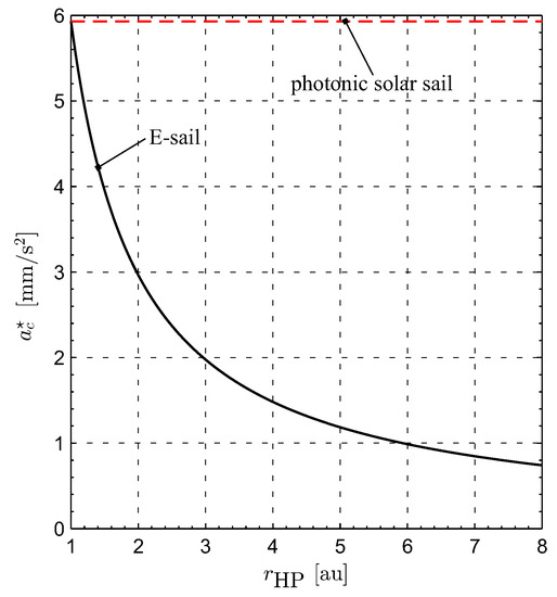 Note that the ratio coincides with the characteristic acceleration necessary for a solar-sail-based spacecraft [8] to maintain a generic HP. Therefore, according to Equation (3), a spacecraft propelled by an E-sail is potentially able to maintain a static equilibrium condition with a characteristic acceleration smaller than that required by a photonic solar sail. This aspect is better appreciated by looking at Figure 3, which shows the variation of with the solar distance as modeled by Equation (3).