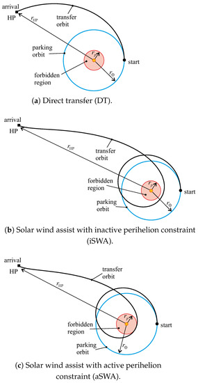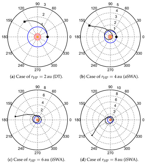 - Direct transfer (DT). During the optimal transfer, the Sun–spacecraft distance r continuously increases with time until the vehicle reaches the target HP, so that the perihelion distance of the optimal transfer coincides with the radius of the circular parking orbit; see Figure 5a.