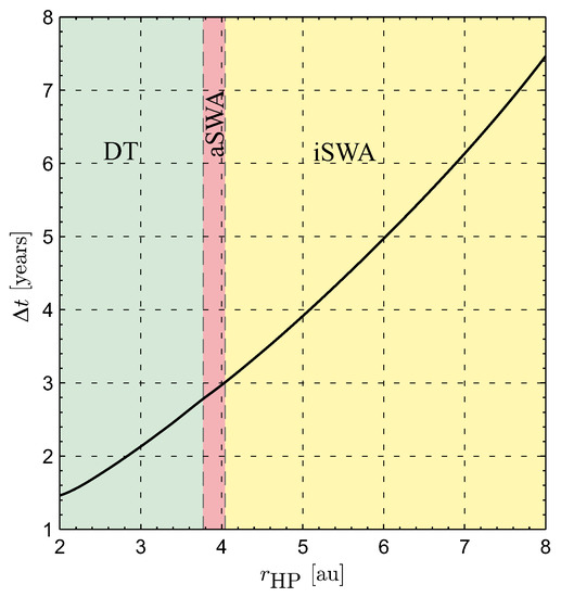 The minimum flight time as a function of the Sun–HP distance in a two-dimensional mission scenario.