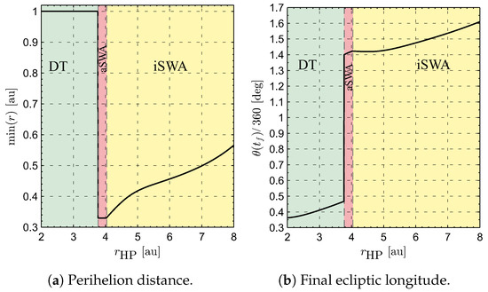 Figure 6 also shows that a DT is obtained when the Sun–HP distance is below , that is, when the spacecraft characteristic acceleration is above ; see also Figure 3. On the other hand, a SWA appears in the optimal trajectory when a medium-performance E-sail is considered with an active constraint (that is, an aSWA) in the range of , that is, when . This behavior is consistent with the curve of Figure 7a, which shows the variation of the perihelion distance of the transfer trajectory with and with the optimal transfer trajectories sketched in Figure 8. Finally, the lines shown in Figure 7b, which report the final value of the ecliptic longitude , define the position of the HP on the ecliptic.