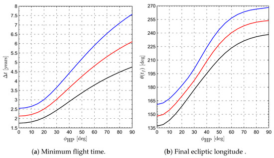 In a more general three-dimensional case, the position of the HP target is identified by the pair , so that the minimum flight time is now a function of two independent design parameters—that is, . Due to the problem symmetry with respect to the ecliptic (see Figure 2) without loss of generality, we assume , where the special case of (or ) corresponds to a target HP point on the ecliptic (or exactly above the Sun’s north pole).