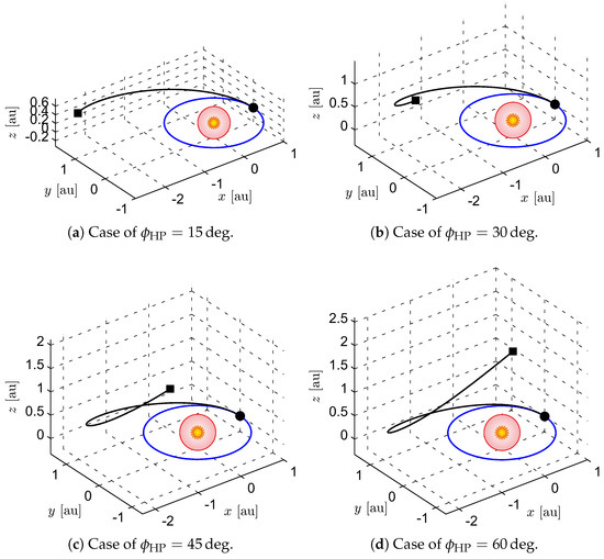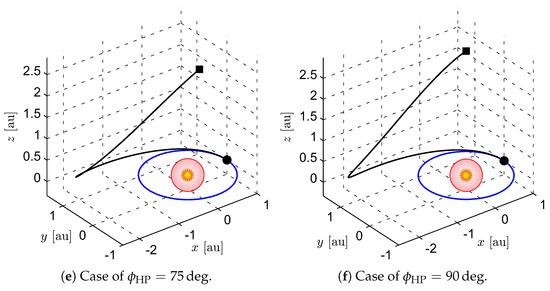 The transfer trajectories when are sketched in Figure 10 for a set of values of to better emphasize the change in the transfer trajectory shape with . The special trajectory reported in Figure 10f shows the transfer toward a polar HP—a stationary point exactly above the Sun’s north pole. A potential mission application that requires the transfer toward such a vantage point for solar observation purposes is discussed in the next section.