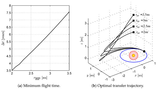 The transfer performance is initially estimated by simulating a two-dimensional mission case in which the HP lies on the ecliptic (i.e., ), and the ecliptic latitude of the target equilibrium point is . In this simplified case, the design parameter reduces to the target solar distance, which was selected to be in the range . The numerical results—that is, the minimum flight time as a function of the Sun–HP distance—are sketched in Figure 6.