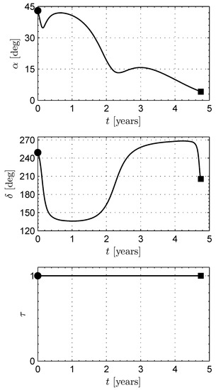 Consider a three-dimensional mission scenario in which the E-sail-based spacecraft reaches a polar HP (a point with ) placed at a distance . In that case, the numerical simulations give the variation of the optimal flight time with the final solar distance as shown in Figure 11a. The mission time increases nearly linearly with the target distance . The optimal transfer trajectories are illustrated in Figure 11b. From the simulation results, we found that a polar HP at a solar distance of can be reached within about , while a distance of is reached in less than . In the latter case, that is, when , the time variations of the three control variables are sketched in Figure 12.