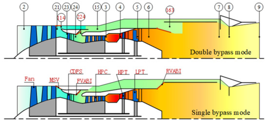 - Chen, H.; Cai, C.; Luo, J.; Zhang, H. Flow control of double bypass variable cycle engine in modal transition. Chin. J. Aeronaut. 2022, 35, 134–147. [Google Scholar] [CrossRef]