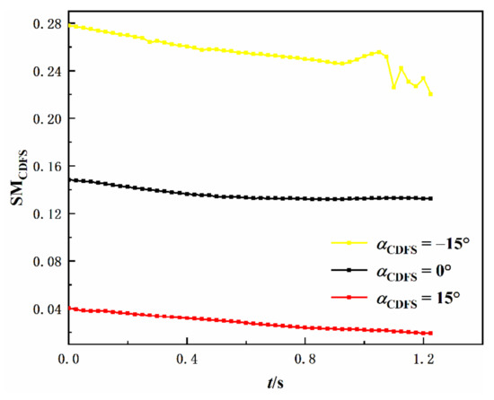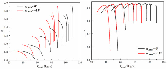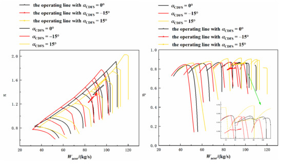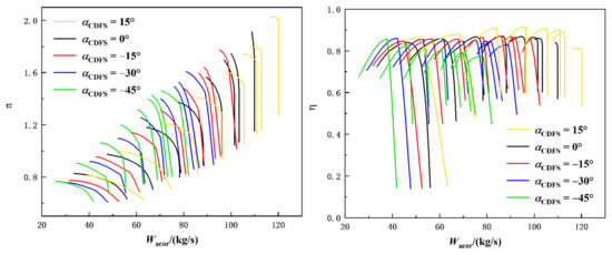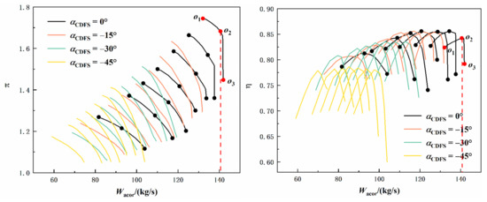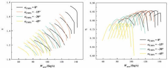 - Simulations of the acceleration process of the variable cycle engine are carried out in this paper. The results show that the designed characteristics of the CDFS can well reflect the change law of the characteristics when the geometric angle changes. When the guide vane angle changes, the component characteristics, such as surge margin, efficiency, etc., will also change accordingly. Therefore, in the subsequent design of the aeroengine control schedule, factors such as limits and performance should be comprehensively considered to determine an appropriate control schedule for the guide vane.