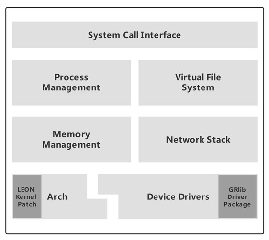 The Linux kernel version used in this article is 5.10. The kernel supports SPARC V8 systems with FPU and MMU in single-core and SMP configurations. The kernel consists of three parts: the Linux mainline kernel, the LEON kernel patch, and the GRLIB driver package. The Linux mainline kernel is a long-term stable version of the official Linux kernel that is actively maintained by the large community and industry. The LEON kernel patch is a LEON support for the Linux kernel actively developed by Cobham Gaisler. The purpose of the GRLIB driver package is to provide support for some intellectual property (IP) core parts of the GRLIB IP library [24]. The structure of the Linux kernel is shown in Figure 2.