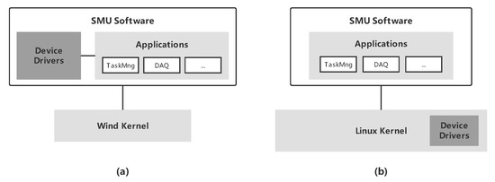 Comparison between SMU software architecture based on VxWorks and Linux. (a) SMU software architecture based on VxWorks. (b) SMU software architecture based on Linux.