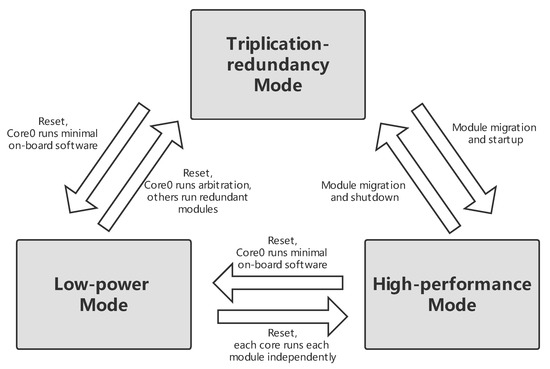 In addition to the above common features, in order to make full use of the advantages of the multi-core processor under different operating conditions, three different structural modes are designed, including low-power mode, triplication-redundancy mode and high-performance mode. As shown in Figure 4, these three modes can be flexibly and dynamically configured according to the satellite operating conditions and mission requirements.