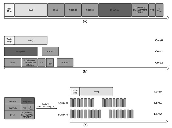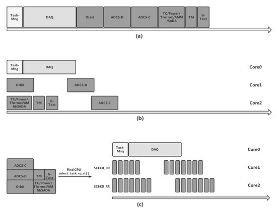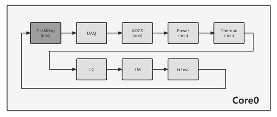 To get the most out of a multi-core processor and take advantage of the benefits of Linux, traditional SMU software architecture based on a single-core processor is no longer suitable. Some existing research designed the SMU software architecture based on the multi-core processor. They are still based on RTOS, and few of them are based on Linux, which is difficult to meet the requirements of complex satellites in the future. He et al. [8] conducted an analysis of dual-core processors and satellite control and data-processing systems, and proposed an asymmetric multiprocessing (AMP) based architecture. The data acquisition/collection thread runs on the core without floating-point unit (FPU), and the other threads run on the core with FPU. The running sequence of the threads is statically arranged. Jan et al. [9] proposed a symmetric multiprocessing (SMP)-based architecture. Each application has a separate partition to realize the isolation and protection. The scheduling unit is a partition, and the partition has no priority. The partition scheduling scheme is determined in advance and repeats for a fixed period. Ref. [10] designed a fault-tolerant processor architecture based on the tri-core processor, which supports three-mode redundancy at the maximum. It can be configured into three modes. In performance mode, the cores run separately. In normal mode, two cores form a dual-mode lock-step fault-tolerant processor, and the other core works independently. In reliable mode, three cores form three-mode redundancy. Although it is a hardware design, it has reference significance to the design of the SMU software architecture.