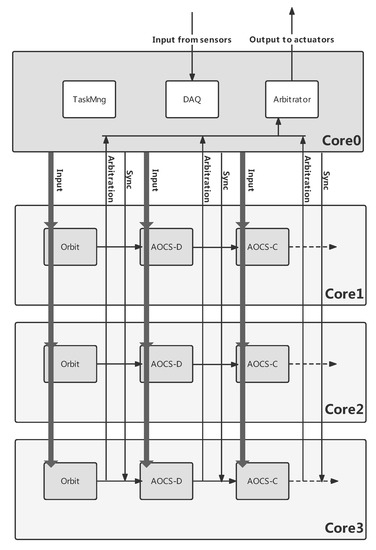Core 1, Core 2 and Core 3 are fault tolerant cores, running the same functional modules respectively. The functional modules on each core are controlled by the TaskMng module running on Core0 and executed in order of priority. After each module completes its task, they wait for Core0 to synchronize (Sync) and arbitrate.