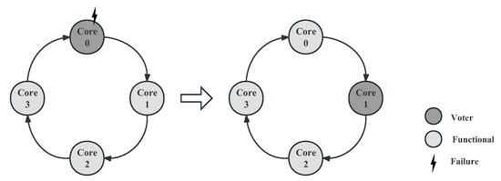 The above is the typical architecture of this mode. In order to deal with the problem that Core0 acting as a voter becomes a single point of failure, a method of the voter rotation of the cores is further designed. As shown in Figure 7, the relation of cores can be regarded as a directed cyclic graph. When the core as the voter fails, find the next normal node along the cycle to conduct recovery and function exchange. To be specific, if Core0 is the voter and there occurs a failure, the arbitrator module is migrated to Core1. If Core1 cannot pass the arbitration, it means Core1 also fails. Then we migrate the arbitrator module further; if no core can pass the arbitration, the failure is not recoverable and the system needs to be reset. Assume that Core1 is normal; the other functions of Core0 are migrated to Core1. After the recovery of Core0, the original functions of Core1 are migrated to Core0. The role exchange between Core0 and Core1 is complete, and Core1 is the new voter.