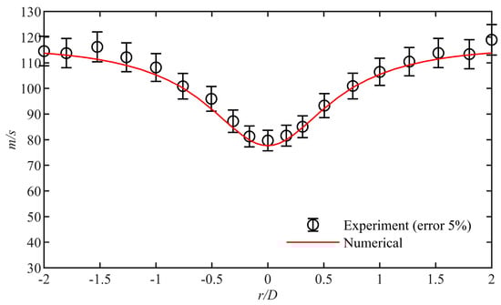 Comparison of experimental (with 5% error) and numerical simulation results for the radial velocity distribution at 0.5D from stagnation point on a no-screen thermocouple (NST).