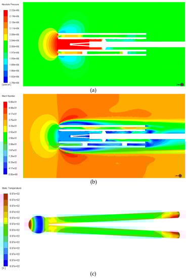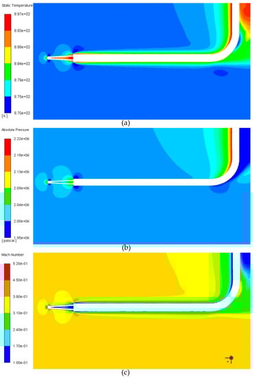 The numerical simulation results of the no-screen thermocouple (NST) are shown in Figure 5 in the form of contours on the longitudinal section where the thermocouple is located. The incoming flow will directly impact the surface of the thermocouple opposite the incoming flow direction so that the temperature of the flow field in this area increases to be close to the total temperature, and the pressure also increases to be close to the total pressure (see Figure 5a,b). In order to better reflect the stagnation process of flow, the velocity contour near the thermocouple is shown in Figure 5c. On the upstream side of the solder ball, the flow velocity decreases under stagnation, which can be used to explain the aforementioned rise in static temperature and pressure. However, on the side of the solder ball, the transition region from upstream to downstream, the flow will accelerate due to the change in flow cross section. This can explain why the static temperature and static pressure in this region are close to those of the incoming flow. This process is similar to flow through a cylindrical (spherical) wall. In addition, at the connection between the thermocouple wire and the signal wire, the flow velocity in this area is also reduced due to the strong stagnation effect of the signal wire on the flow. Therefore, the static temperature and static pressure at this region are also higher.