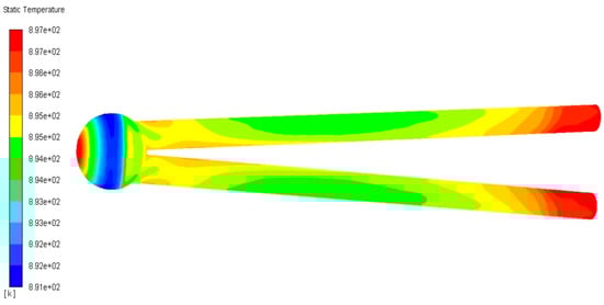 The static temperature distribution of a thermocouple solder ball and wires is shown especially in Figure 6, which is consistent with the flow state of the flow field. The wall temperature of the thermocouple wire changes in a steplike manner from the signal wire to the solder ball. This phenomenon is mainly caused by the stagnation of the flow at the end of the signal wire, resulting in the change of the flow velocity along the cross section of the wire. The slight increase in temperature at the contact region of the thermocouple wire with the solder ball is due to the low velocity zone created by the flow behind the solder ball. In addition, the large velocity changes in the flow around the solder ball cause uneven temperature distribution on the surface of the solder ball. The highest temperature occurred on the windward side of the solder ball at 897.2 K, while the lowest temperature occurred at the upstream and downstream transition regions, which is 891.2 K, and the difference reached 6 K. This may be one of the measurement errors of thermocouples. The average temperature of the thermocouple solder ball surface was calculated as . Submitting this result and the total temperature and static temperature of the incoming flow into Equations (1) and (2), the velocity error and restitution coefficient of the no-screen thermocouple can be obtained as 3.66 K and 84.88%, respectively.