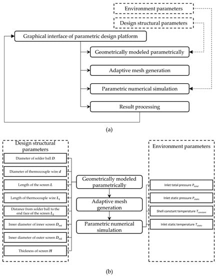 The process of parametric design is mainly to obtain design results by modifying key structural parameters for specific purposes while keeping the topology of the design target unchanged [14]. In addition, the performance parameters of the design results can be directly obtained by the numerical simulation method [12,15], such as the velocity error and restitution coefficient of the thermocouple. A lot of repetitive work is ignored in the parametric design process, which makes it have high design efficiency. For the thermocouple, it has been obtained that the dual-screen thermocouple (DST) is the best-performing one of the three typical configurations according to the above simulation results. Therefore, the topology of the dual-screen thermocouple (DST) will be used as an example for parametric design. The framework of a parametric design and the parameter types and classification in the parametric design process of a dual-screen thermocouple (DST) are shown in Figure 10.