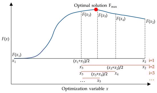 Schematic of the dichotomous search method, where F(x) is the objective function.