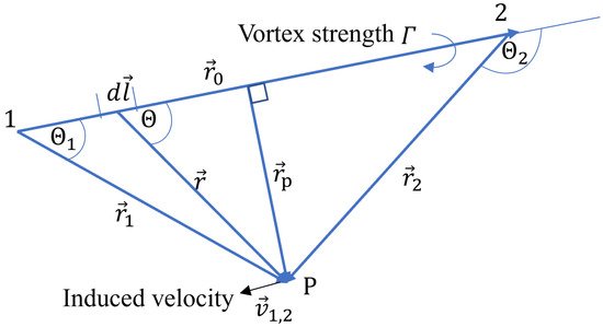 The integration of Equation (7) can be used to calculate the velocity induced by a finite-length vortex segment at any point, as presented in Figure 1.