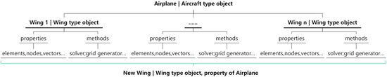 As shown in Figure 5, for an object with multiple lifting surfaces such as aircraft with conventional configurations, an upper class with the name of the aircraft is defined. An array containing all single-surface objects is used to reconstruct a new wing object in the aircraft object initialization process.