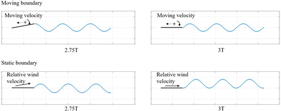 In the boundary condition integration process, different motion modes are often converted to different downwashes applied to a static discretized element model. There is no doubt that, no matter how complex the motion mode is, the boundary condition can be derived from the relative movement relationship between the body coordinate system and the Earth coordinate system. However, the wake update process cannot be easily performed when considering the motion including the translation and rotation in different directions at the same time. A simple illustration of a two-dimensional plate pitch oscillation case is shown in Figure 6, where the wakes on the moving boundary and static boundary are obtained based on the trailing edge path and the relative wind speed, respectively. It can be observed that the relative positions between the wake and the plate for moving and static boundaries are obviously different. Compared with the static boundary with relative wind velocity, the moving boundary can reflect the physical processes of lifting surfaces’ motion and vortex shedding more accurately.