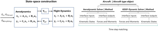 where is the vector composed of the velocity, attitude, and position variables of the rigid body. is the input vector, containing the contributions of the aerodynamic forces and thrusts. As shown in Figure 7, different from the state-space form, which is fixed at linearized points, the grid is updated at every time step in the aerodynamic solver with the kinematic states input from the 6DOF dynamic solver. Similarly, the 6DOF dynamic solver is called at every time step with the forces and moments input from the aerodynamic solver. For different applications with different reduced frequency ranges, the time step of the 6DOF dynamic solver can be adjusted properly to ensure the time step matching and the dynamic solution accuracy. More details about 6DOF rigid body dynamics modeling and calculation can be found in the related reference books [40].