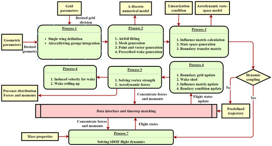 The main feature of the algorithm was described in the previous section, and here, the detailed flow chart of the algorithm is shown in Figure 8. According to the imported information on the geometric and grid parameters, the initialization of Process 1 and Process 2 is first performed. All the elements, nodes, and relative vectors are generated at this step. Then, in Process 3, the influence matrices are calculated, and the aerodynamic state-space matrices can be derived based on the given linearization condition and the prescribed wake. Actually, the state-space data can also be exported at any time step to represent the instantaneous motion state and wake shape. The loop of time stepping is defined by Processes 4 to 6. If the direct dynamic coupling is considered, the boundary motion is calculated by an additional dynamic solver at every step instead of being obtained from the predefined trajectory. Finally, the time history of the steady and unsteady parts of the aerodynamic forces at each element is derived.