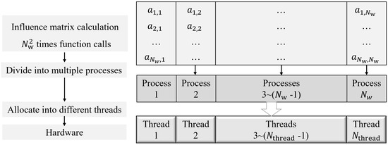 For the simulation of large-scale numerical problems, parallel optimization can greatly reduce the computational time [41]. The main idea is to make full use of the multi-core and multi-threading of the computer to carry out multiple operations that do not need data exchange and are not affected by the processing sequence. Although the UVLM is much more computationally efficient than high-order CFD, it is still time-consuming in some cases that involve models with a huge number of wakes. After analyzing the execution process and data structure of the calculation method, it was found that many calculation steps, such as wake generation, influence matrix update, and force calculation, can be constructed in the form of parallel computation. For example, the update of the influence matrix at each step requires calling the function up to times. As shown in Figure 9, the calculation of can be divided into sub-processes, each of which is allocated to a different thread. To verify the improvement of the computational efficiency achieved by parallel optimization, a time-stepping UVLM case with 256 boundary elements, 2080 wake elements, and 80 substeps was calculated on a laptop with an Intel(R) Core(TM)i7-11800H processor. The total running time and the running time of several time-consuming processes are given in Table 1. The running time of each process was reduced significantly. As the number of wake vortices is much larger than the number of boundary vortices, the efficiency improvement in the calculation of wake vortices was the most obvious. The significant improvement of the computational speed made it possible to run simulations of lager-scale models on an ordinary personal computer.