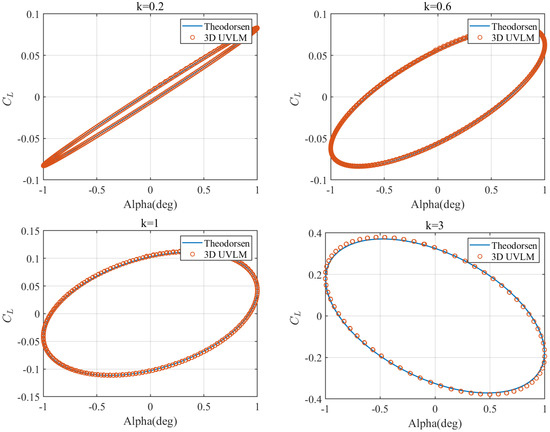 In this section, the proposed numerical algorithm is applied for verification. It is known that the Theodorsen method is often used in the unsteady case for two-dimensional (2D) benchmark aerodynamic problems [42]. A three-dimensional (3D) infinite-span wing (with a considerable aspect ratio) is generally considered to have the same aerodynamic results as 2D models. A 3D wing with an aspect ratio of 500 was modeled to verify the proposed algorithm. The angle of attack was given as , and the reduced frequency was defined as . The unsteady pitching oscillations at different reduced frequencies were compared to show whether the algorithm was able to capture the unsteady effect. Figure 10 shows the comparison of the lift coefficients at different reduced frequencies using the Theodorsen method and the 3D UVLM method in the state-space form. Obviously, the results of the Theodorsen method and the UVLM method at different reduced frequencies were in good agreement.