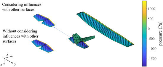 Note that the influence of aerodynamic forces between multiple lifting surfaces cannot be ignored. Intuitively, the force calculated with the consideration of the influences between multiple surfaces should be different from the one calculated independently. It is also verified in Figure 13 that the pressure distribution of the horizontal tail calculated with the consideration of the influences from other surfaces (the upper left plot) was obviously different from the one calculated independently (the bottom left plot). As shown in Table 3, the extreme values of the pressure and the total lifts were also different. Although the absolute value of total lift varied little, the effect on the pitching moment was of the same order of magnitude as the effect of the elevator. As a matter of fact, the impact of wingtip vortices on the tail control surface must be considered in the aircraft design process [43].