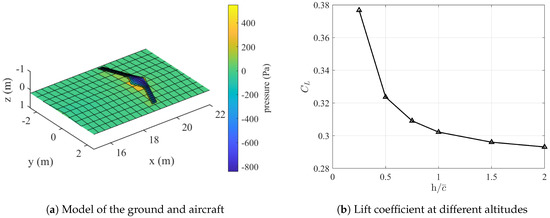 For some engineering applications, the influence of non-lifting surfaces must be concerned, and this can also be performed using the proposed algorithm through appropriate modeling techniques. Figure 14 gives an example of ground effect modeling, in which the ground is directly represented by a set of boundary vortices without additional derivation and code modification. The x-axis in Figure 14b is the altitude normalized by the mean aerodynamic chord length of the aircraft.