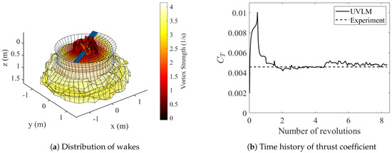 The aerodynamic simulation of propeller rotation is a typical problem involving wake–boundary interactions. Figure 15a gives the distribution and strength of wake vortices around a twin blade propeller after starting for a while. The details of the geometric model and simulation parameters are given in Table 4. There are obvious overlaps between wakes and blades due to the complex induced velocity. The time history of the thrust coefficient is shown in Figure 15b. When the blades start rotating, the thrust first increases rapidly due to the strong effect of the starting vortex shedding, then it decreases with the movement of the wakes and the wake–boundary interactions and, finally, fluctuates within a relatively stable range near the experimental result given in the literature [44]. This matches how the aerodynamic force of the real propeller develops. Combined with the application in the previous section, the propeller can be modeled as a part of the whole aircraft for the aerodynamic numerical calculation of aircraft with more complex configurations.