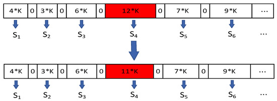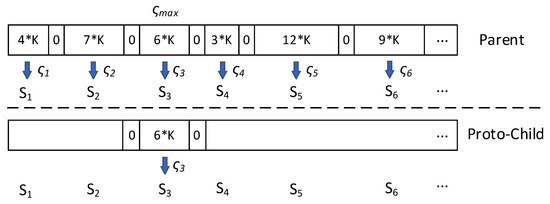 The initialization process of the computing task queue is shown in Figure 4. Based on the start and end time of the task in a front-to-back order, which is located at the top of the queue, it will be assigned to the computing satellites first. This way has a well-balanced initial task queue. Each individual in the task queue represents a batch of possible scheduling of task blocks, and the sub-computing tasks in the task blocks can contain more than one, as shown in Figure 4. The task blocks are separated by a 0 symbol, where Sj represents the computed satellite j.
